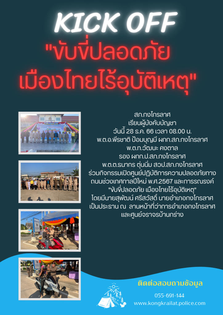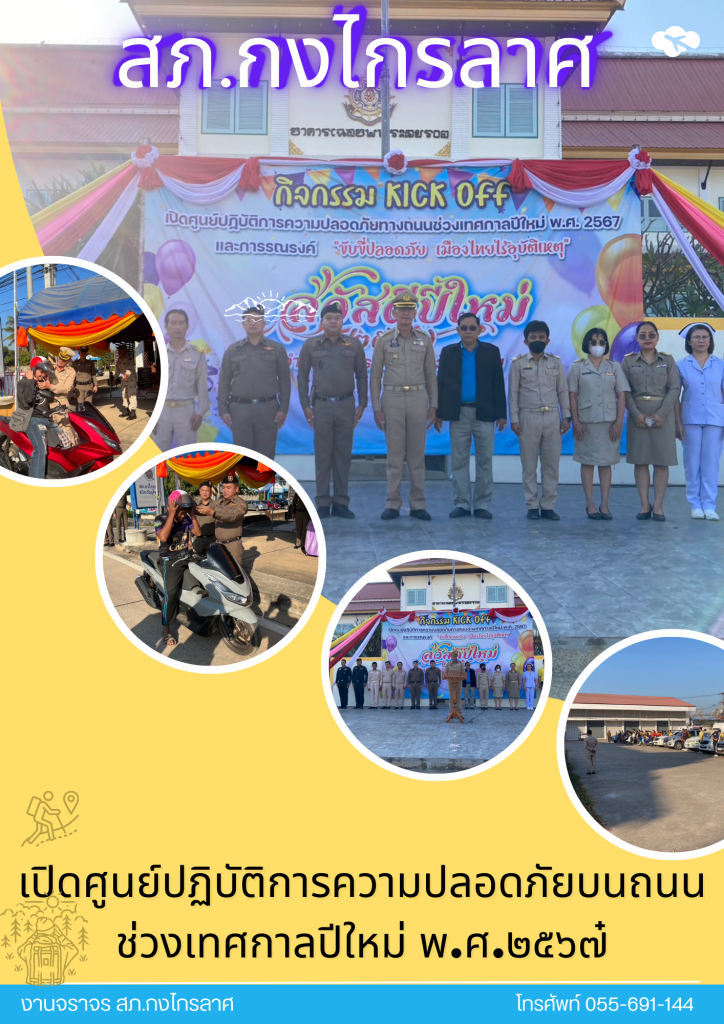 วันนี้ 28 ธ.ค. 66 เวลา 08.00 น. พ.ต.อ.พีรชาติ ป้อมบุญมี ผกก.สภ.กงไกรลาศ พ.ต.ท.วัฒนะ คงตาล รอง ผกก.ป.สภ.กงไกรลาศ พ.ต.ต.ธนากร ตุ่นนิ่ม สวป.สภ.กงไกรลาศ ร่วมกิจกรรมเปิดศูนย์ปฏิบัติการความปลอดภัยทางถนนช่วงเทศกาลปีใหม่ พ.ศ.2567 และการรณรงค์ “ขับขี่ปลอดภัย เมืองไทยไร้อุบัติเหตุ” โดยมีนายสุพัฒน์ ศรีสวัสดิ์ นายอำเภอกงไกรลาศ เป็นประธาน ณ ลานหน้าที่ว่าการอำเภอกงไกรลาศและศูนย์จราจรบ้านกร่าง