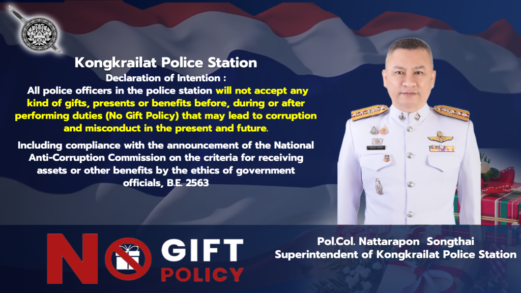สภ.กงไกรลาศ ขอแสดงอินโฟกราฟิกนโยบายไม่รับของขวัญและของกำนัลทุกชนิด (No Gift Policy) จากการปฏิบัติหน้าที่