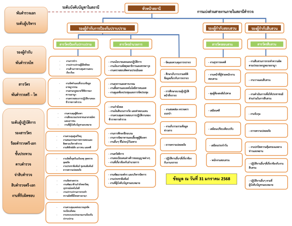 มีหน้าที่เกี่ยวกับการอำนวยการ การวางแผน การตรวจสอบติดตามและประเมินผลงานที่เกี่ยวกับนโยบาย ยุทธศาสตร์ และแผนงานของสถานีตำรวจ งานการบริหารบุคลากร งานจเรตำรวจงานกิจการพิเศษ งานความมั่นคง การศึกษา การฝึกอบรม งานวิชาการ สวัสดิการ การพัฒนา การบริหารจัดการ งบประมาณ การเงิน การพัสดุ การพลาธิการและสรรพาวุธ การส่งกำลังบำรุง รวมทั้งลักษณะงานอื่น ๆ ที่เกี่ยวข้องหรือเป็นส่วนประกอบของงานดังกล่าว เพื่อส่งเสริมหรือสนับสนุนการปฏิบัติงานของสถานีตำรวจ 2) งานป้องกันปราบปราม